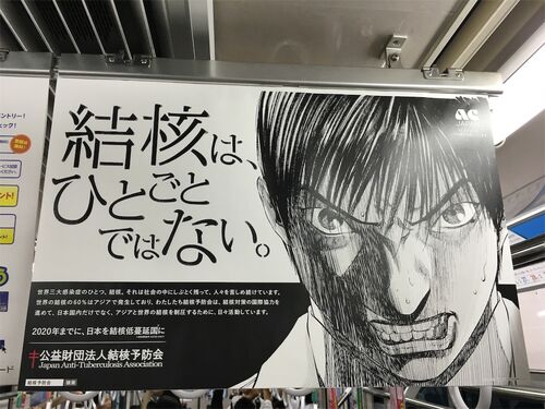 結核予防会「結核は、ひとごとではない。」中づり 「ブラックジャックによろしく」の主人公の顔面ドアップと「結核は、ひとごとではない。」のメインコピーのおどろおどろしい字体。インパクトがすごいですね。 ちょうど最近千葉で結核の集団感染の事件があ…