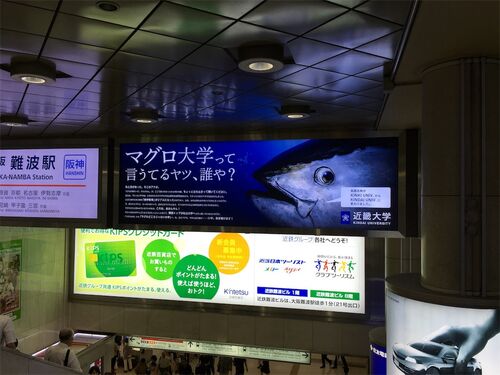 近畿大学「マグロ大学」看板@近鉄難波駅 キャッチコピー「マグロ大学って言うてるヤツ、誰や?」 近鉄難波駅の改札に向かって降りる階段の正面にあるオデコ看板です(階段を降りるところの正面にある看板を"オデコ看板"といいます)。マグロのビジュアルのイ…