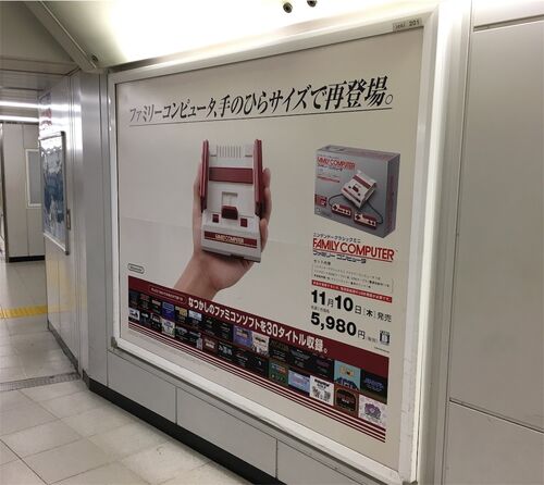 ファミリーコンピュータ ニンテンドークラシックミニ 交通広告(看板)@JR新宿駅 「ファミリーコンピュータ、手のひらサイズで再登場。」 昔のファミリーコンピュータを再現し、テレビにつなぐだけで30タイトルが遊べる復活製品。サイズも手のひらサイズにな…