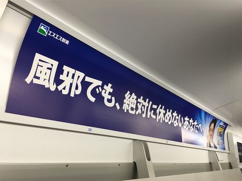 「風邪でも、絶対に休めないあなたへ。」有吉さん起用のエスタックイブ 4連ばり分まど上広告(エスエス製薬)@東京メトロ 通常のまど上ポスターの4倍分の露出量で横長ーく訴求しています。「風邪でも、絶対に休めないあなたへ。」というコピーからも、ターゲ…