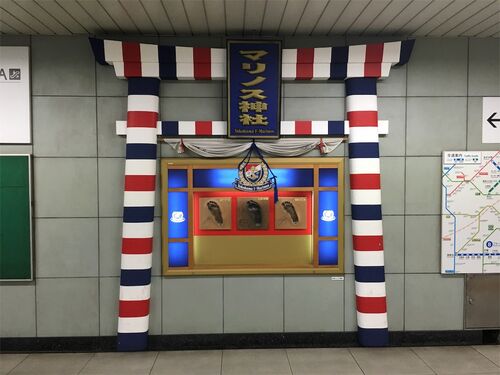 横浜F・マリノス マリノス神社@新横浜駅 マリノスの勝利を祈願して、本拠地日産スタジアム最寄駅の横浜市営地下鉄新横浜駅の改札外に設置されています。神社の真ん中には中澤佑二選手、栗原勇蔵選手、兵頭慎剛選手の足型があります。設置されたのは2007年だ…