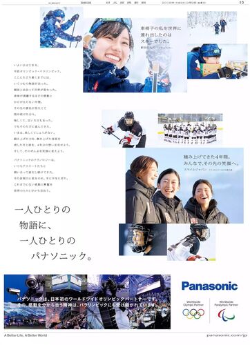 Panasonic 2月9日日本経済新聞朝刊 全面広告 平昌オリンピック 「一人ひとりの物語に、一人ひとりのパナソニック。」 巨大企業ならではのオリンピック協賛広告。言うことも広告もスケールがデカいです。 平昌オリンピックはチラチラ見ております。昨日のモー…
